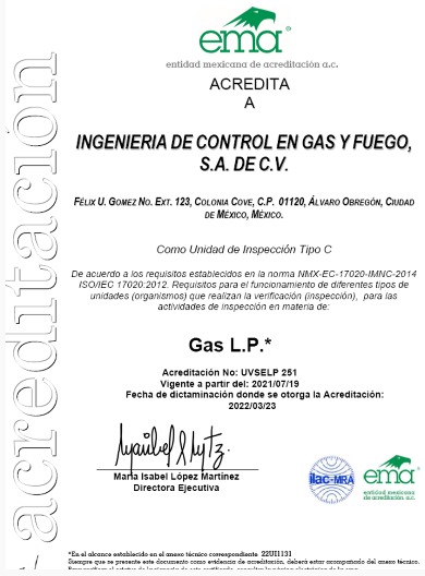 Nuestra Unidad de Inspección de Gas LP cuenta con acreditación vigente ante la Entidad Mexicana de Acreditación (ema, a.c.), conforme a la norma NMX-EC-17020-IMNC, la cual establece los requisitos para la operación, competencia y confiabilidad de las unidades de inspección en México.